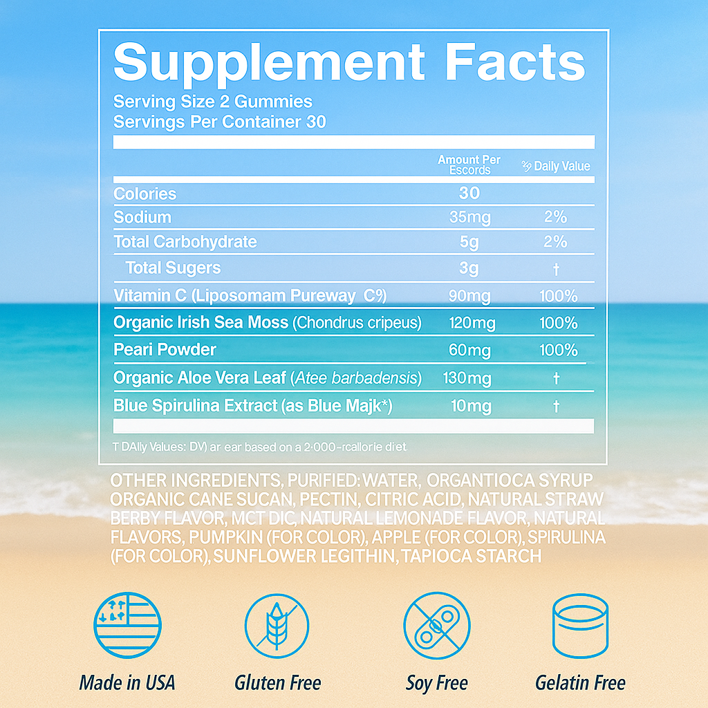 Sea Moss Glow Gummies support skin hydration, balanced energy, and digestive wellness.